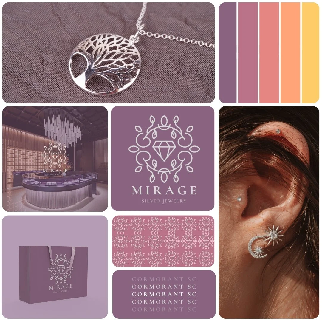 A refined and romantic brand identity for Mirage, a silver jewelry brand that blends softness with luxury. The visual system is built around a muted mauve and rose-toned palette, creating warmth and femininity while allowing the brilliance of silver to stand out. Ornamental linework, delicate botanical curves, and a diamond centered emblem give the brand a regal yet modern character.